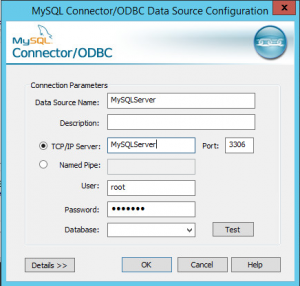 Aparecerá uma janela para conexão com o servidor MySQL. Insira as informações e clique em OK. Obs: Existem diversas opções que podem ser configuradas, além da base. Para detalhes, clique no botão **“Details »”. **Como eu vou me conectar em diversas bases que foram restauradas e eu não quero criar um conector para cada base, deixarei o campo “Database” vazio.