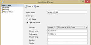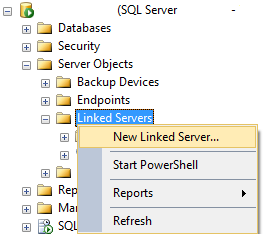 Agora, basta criar o Linked Server: Em Object Explorer, expanda a treeview Server Objects > Linked Server. Clique com o botão direito e selecione a opção New Linked Server…