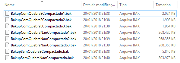 backup database BackupDividido to disk = N'C:\Microsoft SQL Server\MSSQL14.SQL2017\MSSQL\Backup\BakupComQuebraECompactado1.bak', disk = N'C:\Microsoft SQL Server\MSSQL14.SQL2017\MSSQL\Backup\BakupComQuebraECompactado2.bak', disk = N'C:\Microsoft SQL Server\MSSQL14.SQL2017\MSSQL\Backup\BakupComQuebraECompactado3.bak' WITH COMPRESSION backup database BackupDividido to disk = N'C:\Microsoft SQL Server\MSSQL14.SQL2017\MSSQL\Backup\BakupSemQuebraECompactado.bak' WITH COMPRESSION backup database BackupDividido to disk = N'C:\Microsoft SQL Server\MSSQL14.SQL2017\MSSQL\Backup\BakupComQuebraNaoCompactado1.bak', disk = N'C:\Microsoft SQL Server\MSSQL14.SQL2017\MSSQL\Backup\BakupComQuebraNaoCompactado2.bak', disk = N'C:\Microsoft SQL Server\MSSQL14.SQL2017\MSSQL\Backup\BakupComQuebraNaoCompactado3.bak' backup database BackupDividido to disk = N'C:\Microsoft SQL Server\MSSQL14.SQL2017\MSSQL\Backup\BakupSemQuebraNaoCompactado.bak'