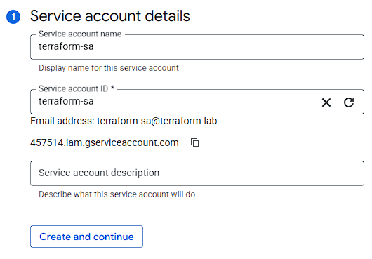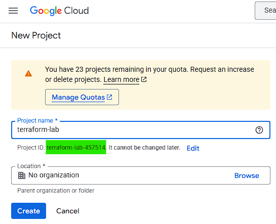 terraform-lab) e clique em “Criar” - Guarde o ID do projeto — vamos usar mais adiante